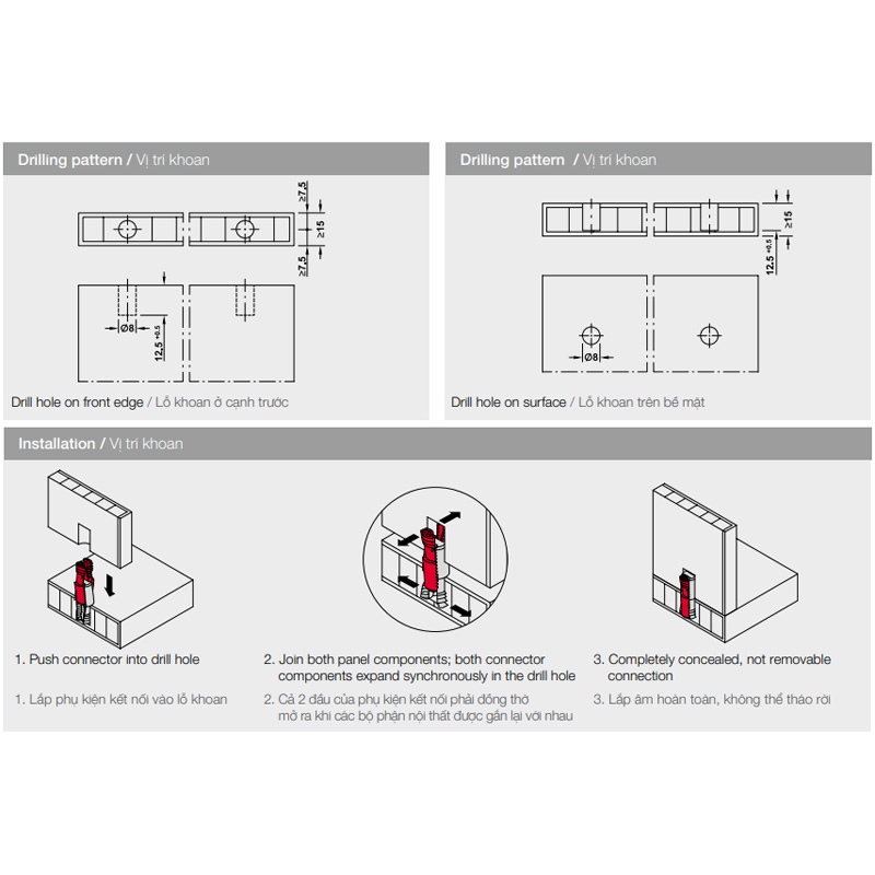 • Chức năng: Khi hai phần nội thất được nối với nhau, hai đầu phụ kiện kết nối mở rộng vào trong lỗ khoan, sau đó, vỗ nhẹ vào hai ván nội thất, hai phần của phụ kiện kết nối được đẩy lên nhau và mở rộng ra.